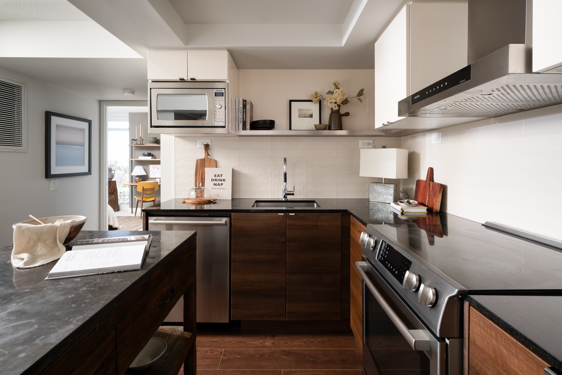 A masterfully executed layout: functional with distinct living, dining, kitchen and den, while maintaining a seamless flow for cooking, entertaining and gathering. Two bedrooms, tucked away behind a hallway, including its primary with North and West exposures, a 4 piece ensuite, walk-in closet with custom organizers, and powered roller shades. Off the entrance is a walk-in coat closet and a versatile den, and its kitchen is finished with full-sized Bosch stainless steel appliances and plenty of cooking space. Tons of storage, including its locker on P1 and parking on P2.