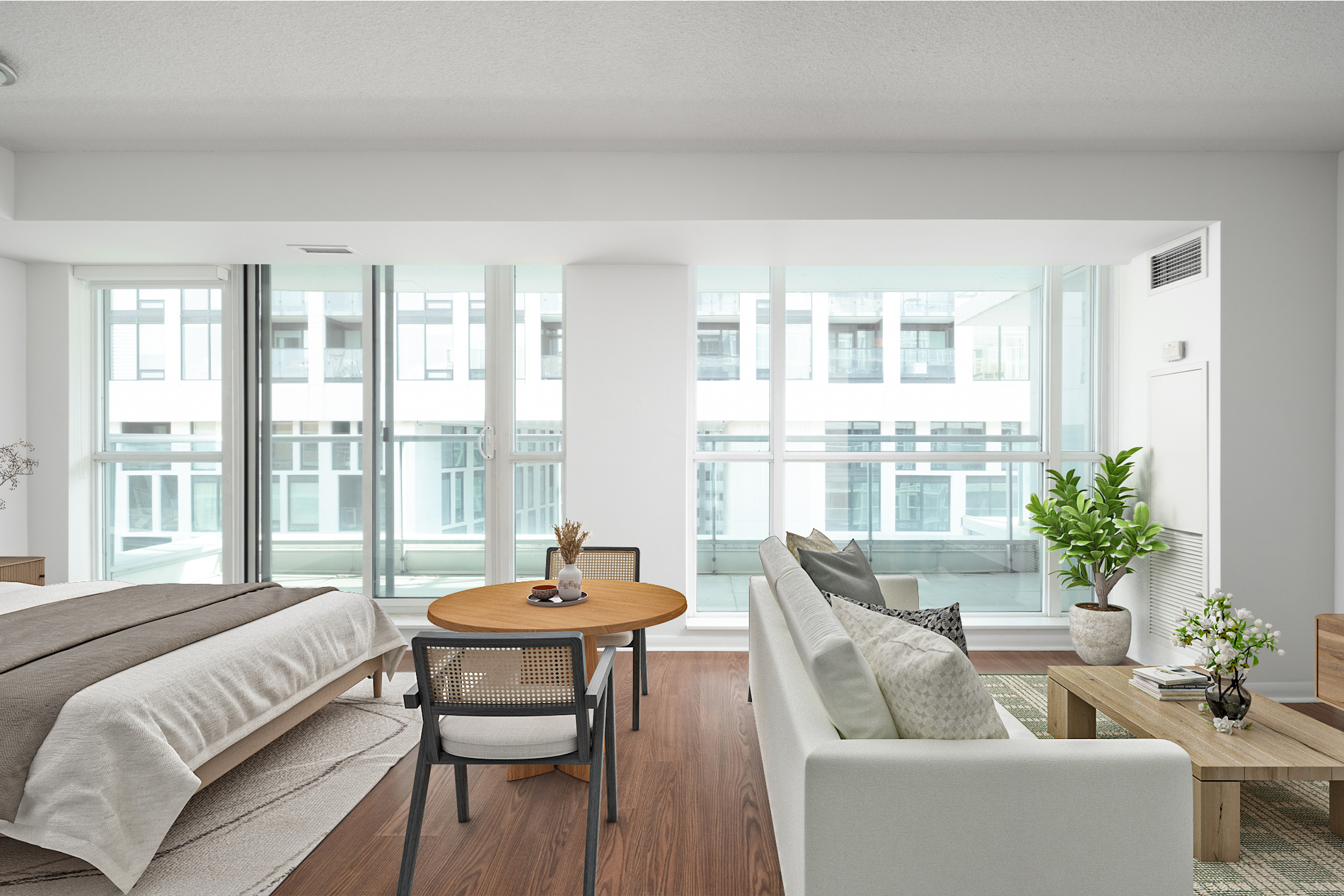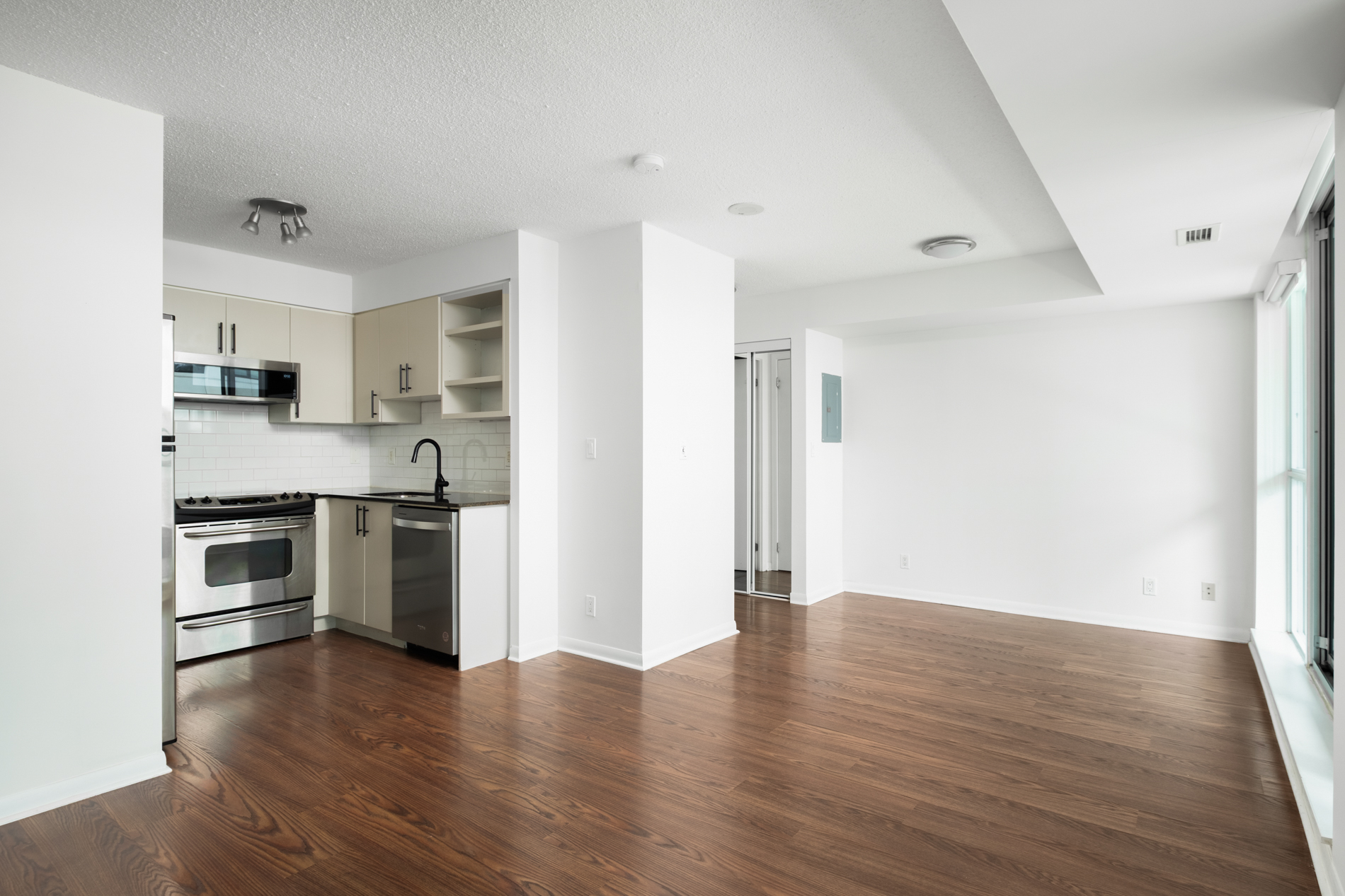 Smart and savvy buyers: this *the* studio that is bigger and better than the rest. A wonderfully designed 455 sqft wide layout that maximizes its living/dining/sleeping flex space with a designated kitchen (with full sized appliances!) and an opportunity to create a true bedroom (with a door + windows). Delightfully bright with its floor to ceiling windows and an extra large balcony. Extra affordable with low maintenance fees (less than $440/month!). And surprisingly practical with plenty of space to live, work, and stretch out.